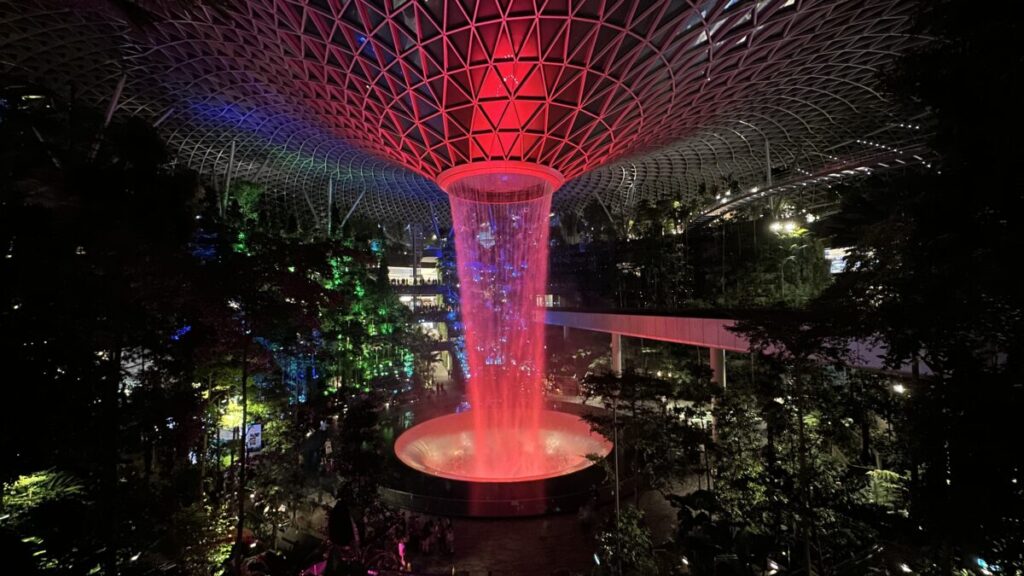 ジュエルの絶対的シンボル。高さ約40mから落ちる水のカーテンは、屋内人工滝としては世界最大級の規模。吹き抜け構造の建物の中心部から轟音とともに落下する水の迫力は、写真では伝わりません。夜になるとライトアップショーが加わり、光と水が織りなす幻想的な空間に早変わりします。