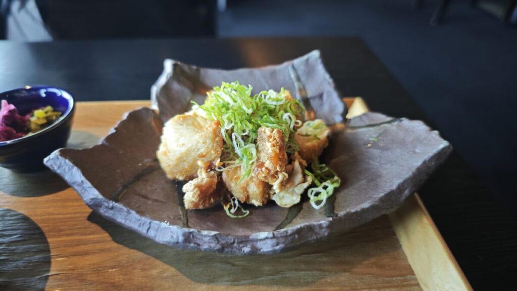 注文した鶏のから揚げは、ジューシーな銘柄鶏「大山鶏」をカラッと揚げ、ネギたっぷりのソースをかけた一品。