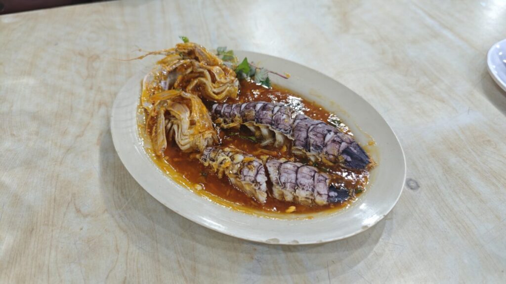 テーブルに着席して思い出し、確認すると300gで2匹、調理法はガーリックソースとのことでした。