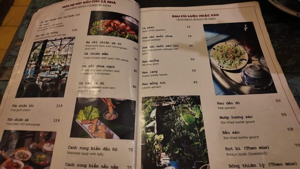 メニューは100種類近くあるそうで、ベトナム各地の家庭料理を網羅しています。価格帯は一品 50,000 VND 〜 150,000 VND(約300円〜900円) 程度と非常に良心的です。