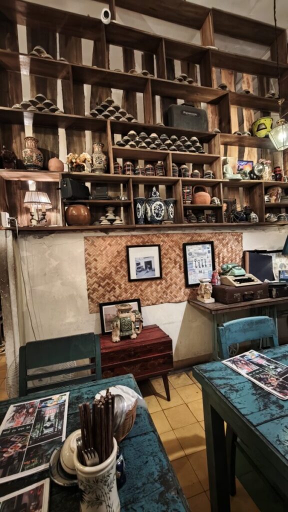 インテリア: ベトナム伝統の「黄色」を基調とした壁に、深みのある古材の家具。棚にはアンティークのラジオや電話、素朴な陶器が並び、オーナーのこだわりが細部に宿っています。