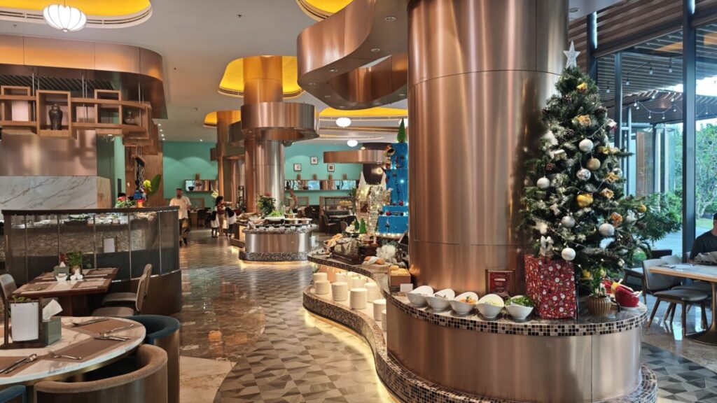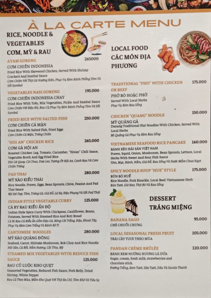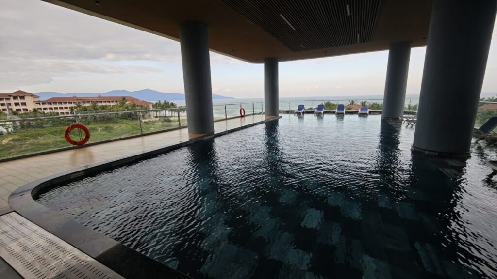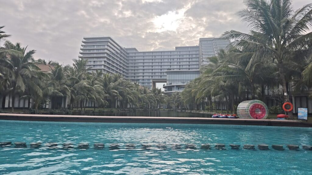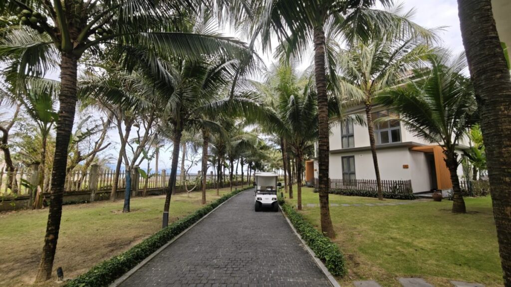 ダナン国際空港からは約14km(車で20〜30分程度)。タクシーやGrabを利用するのが一般的で、空港から比較的スムーズにアクセスできます。ただし、リゾート周辺は繁華街から離れているため、ローカルレストランは多少あるものの徒歩圏内でアクセスできる飲食店も限られています。