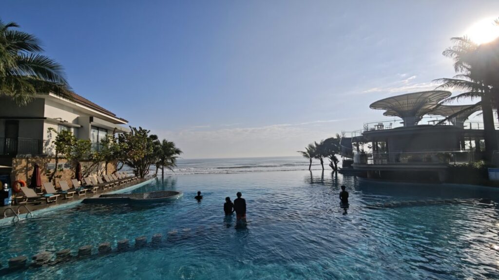ビーチの近くに来ると、プールが広がっています。海につながるインフィニティープール仕様で、広さもあり、非常にくつろげる空間が広がっていました。